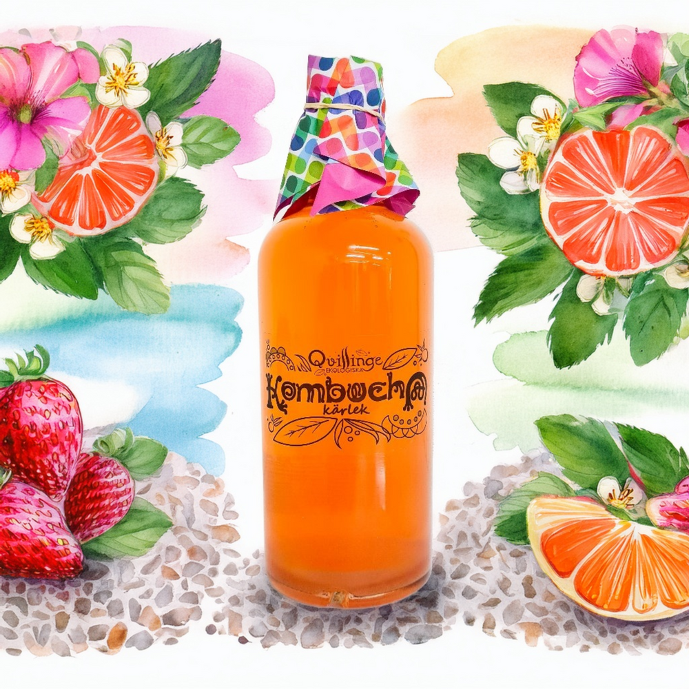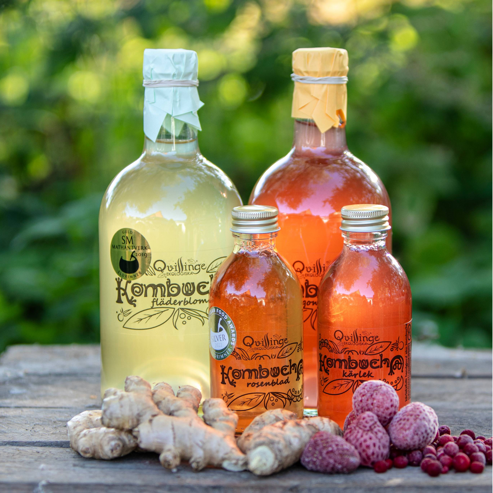 Vi inspireras av naturens skafferi när vi smaksätter vår kombucha, och vi använder gärna vad säsongen har att erbjuda. Det innebär att vi inte alltid kan erbjuda vissa smaker utan när det är slut så är det slut för säsongen. Men vi har ett stort utbud av olika smaker som vi gör året runt och vissa av dom har blivit storfavoriter hos många. Så oavsett vad du gillar så brukar vi alltid ha något som faller i smaken. Vår vision är att göra den bästa och godaste kombuchan på ett holistiskt hållbart sätt, och att vara en inspiration till andra att göra de bästa valen med omtanke till vår omgivning.